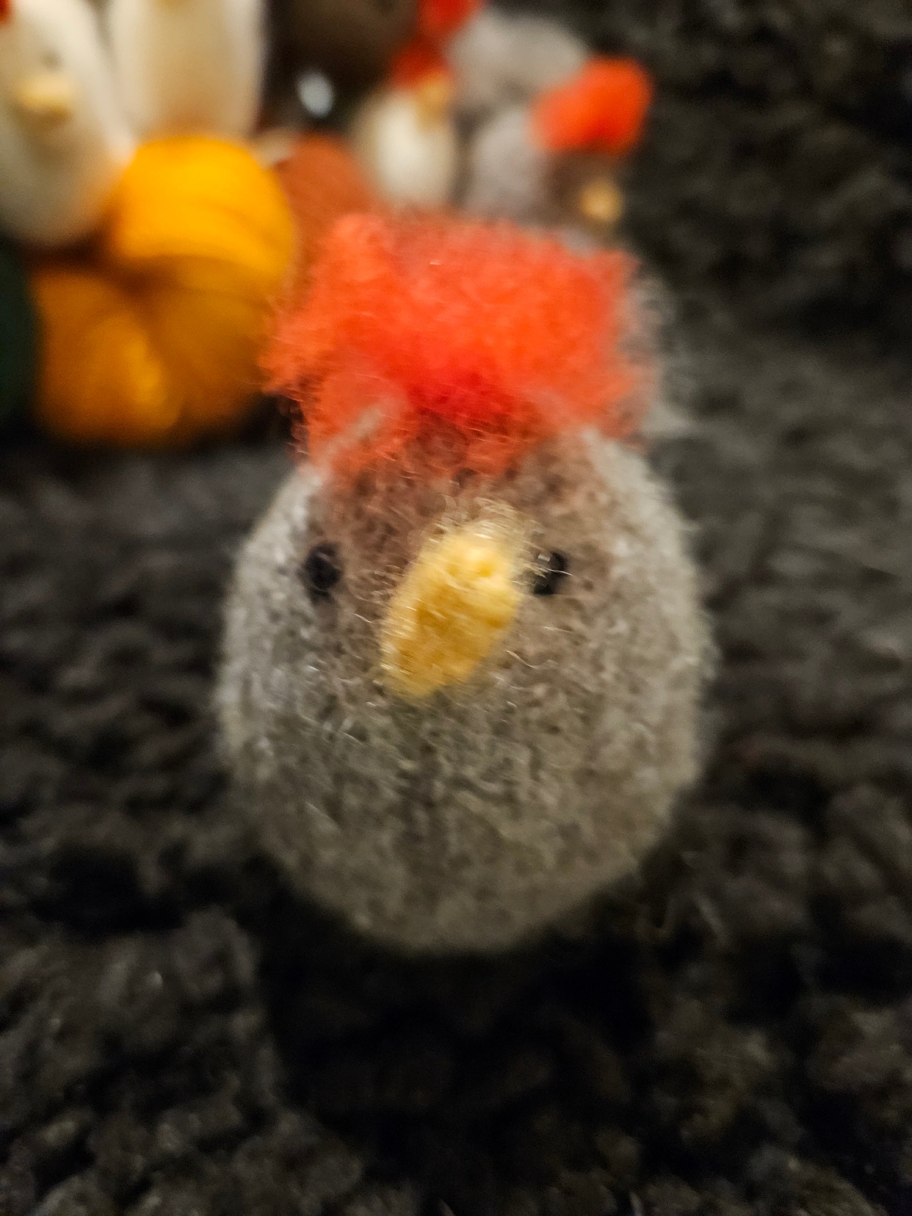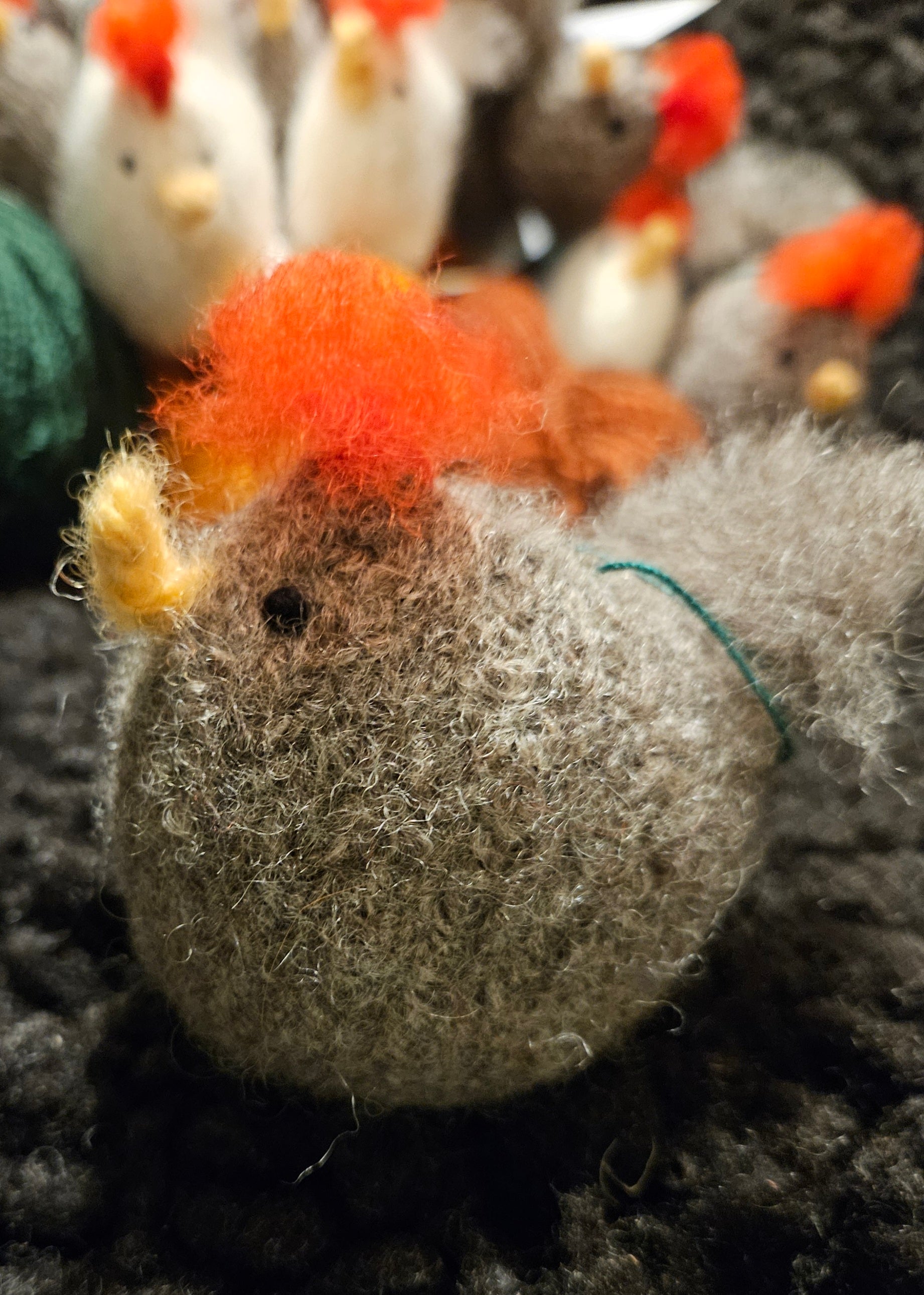 This Whimsical Barn Chick is ready to brighten your day. 3L&S Romney gray yarn with a crown of hand-dyed locks. Then Knitted and felted.