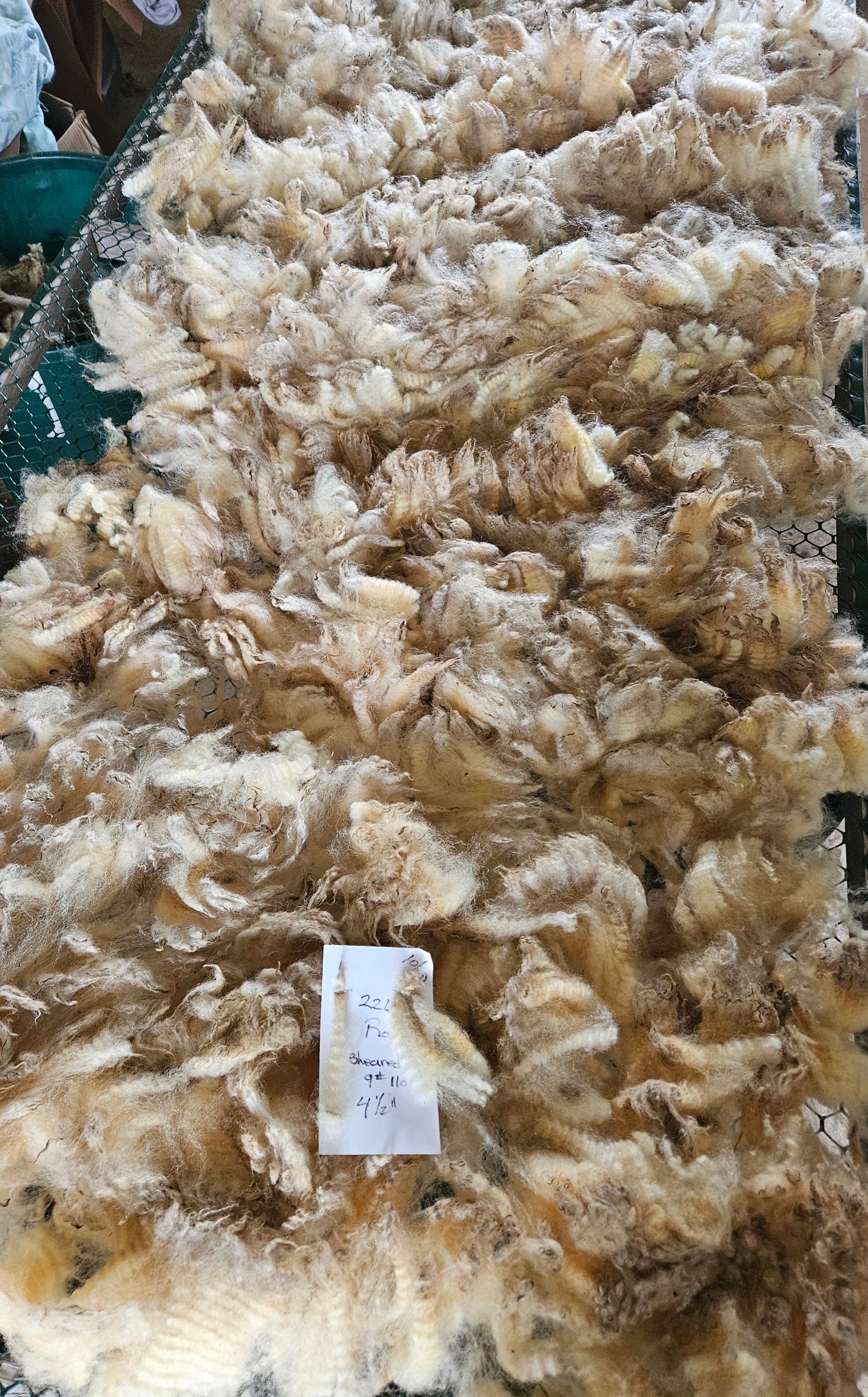 Ready for Handspinning. Heavily skirted fleece with any damaged or heavily Veggie Matter contaminated areas removed. Hand Spinning Ready.