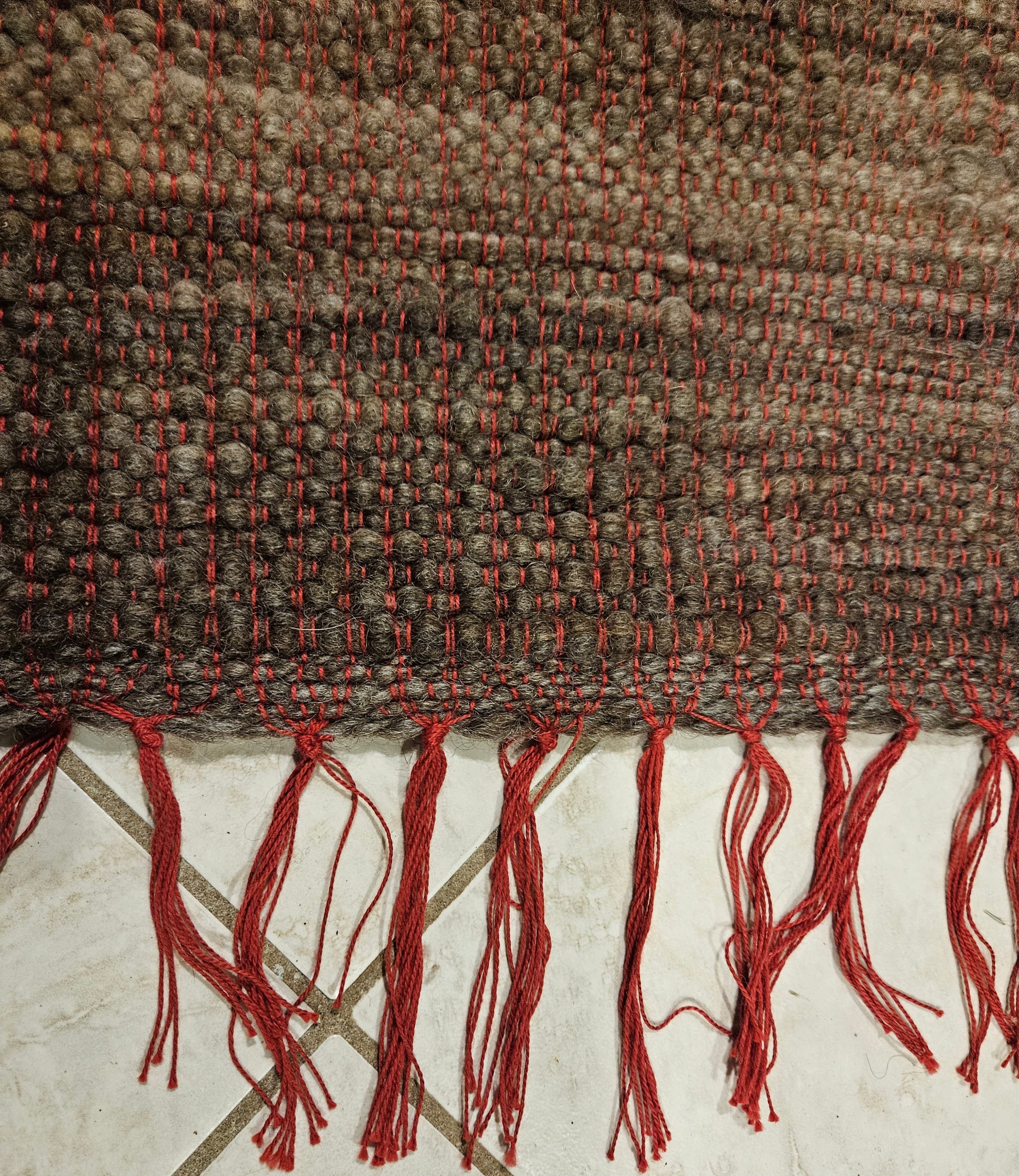 Floor Rug Or Wall Hanging! Hand woven by Woman Owned Fiber Arts Business. Natural Color Gray Romney Wool and Cotton Cranberry Warp!