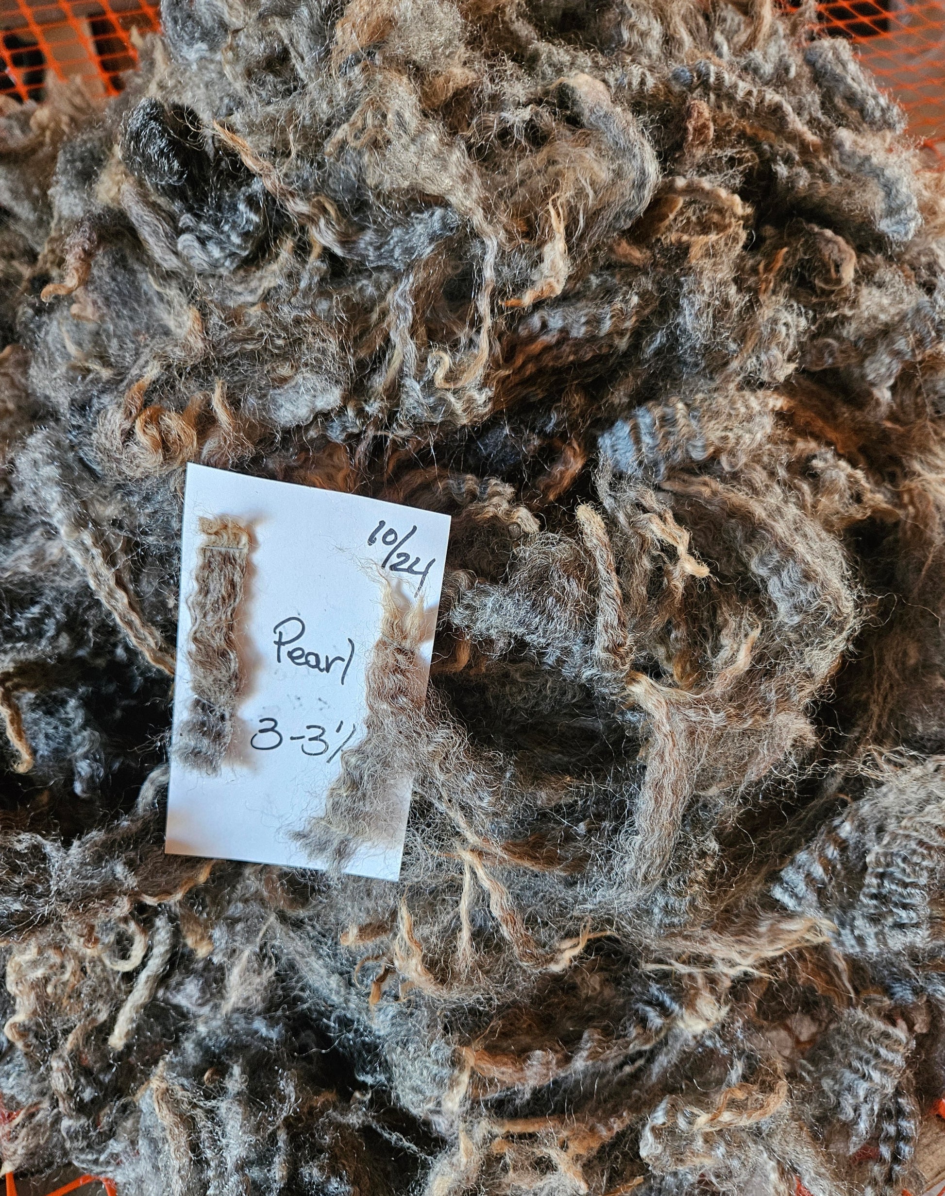 I had this fleece stashed in my vault for her gorgrous color & personality! Second shearing as a lamb so shorter lock structure but her fleece is incredibly clean. This fleece has a dry hand to it but should wash up nicely. Lock structure is the fun french fry throughout the fleece.