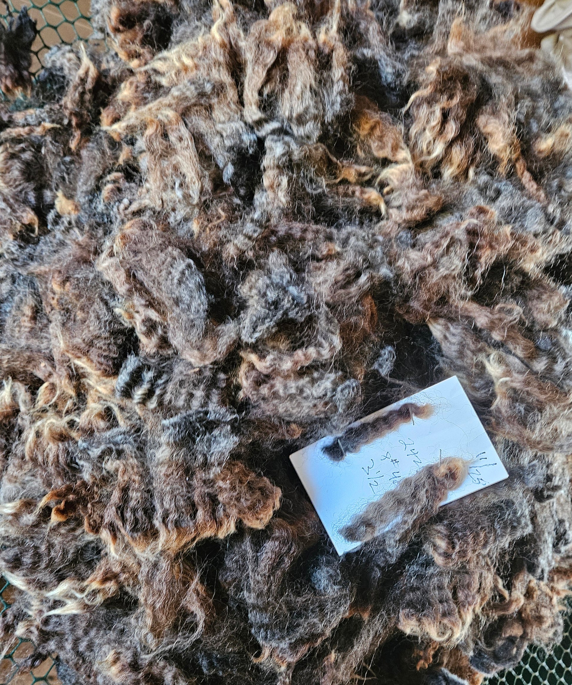 Romney Yearling Ewe Rich Iron Gray/Cinnamon tones & Blonde Tips. Open wavy lock Structure. Handspinning ready!