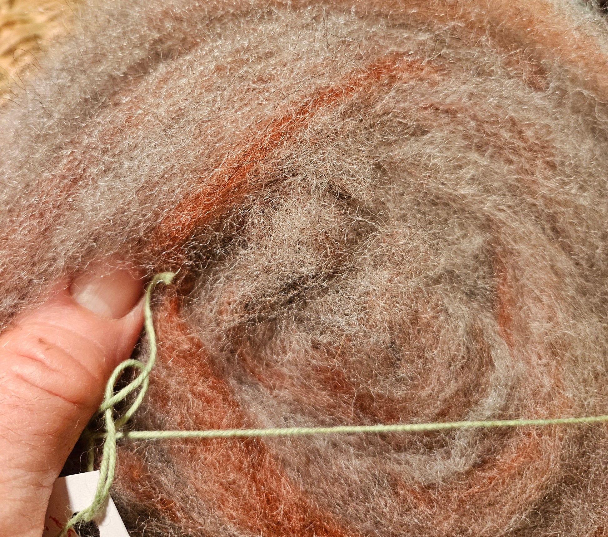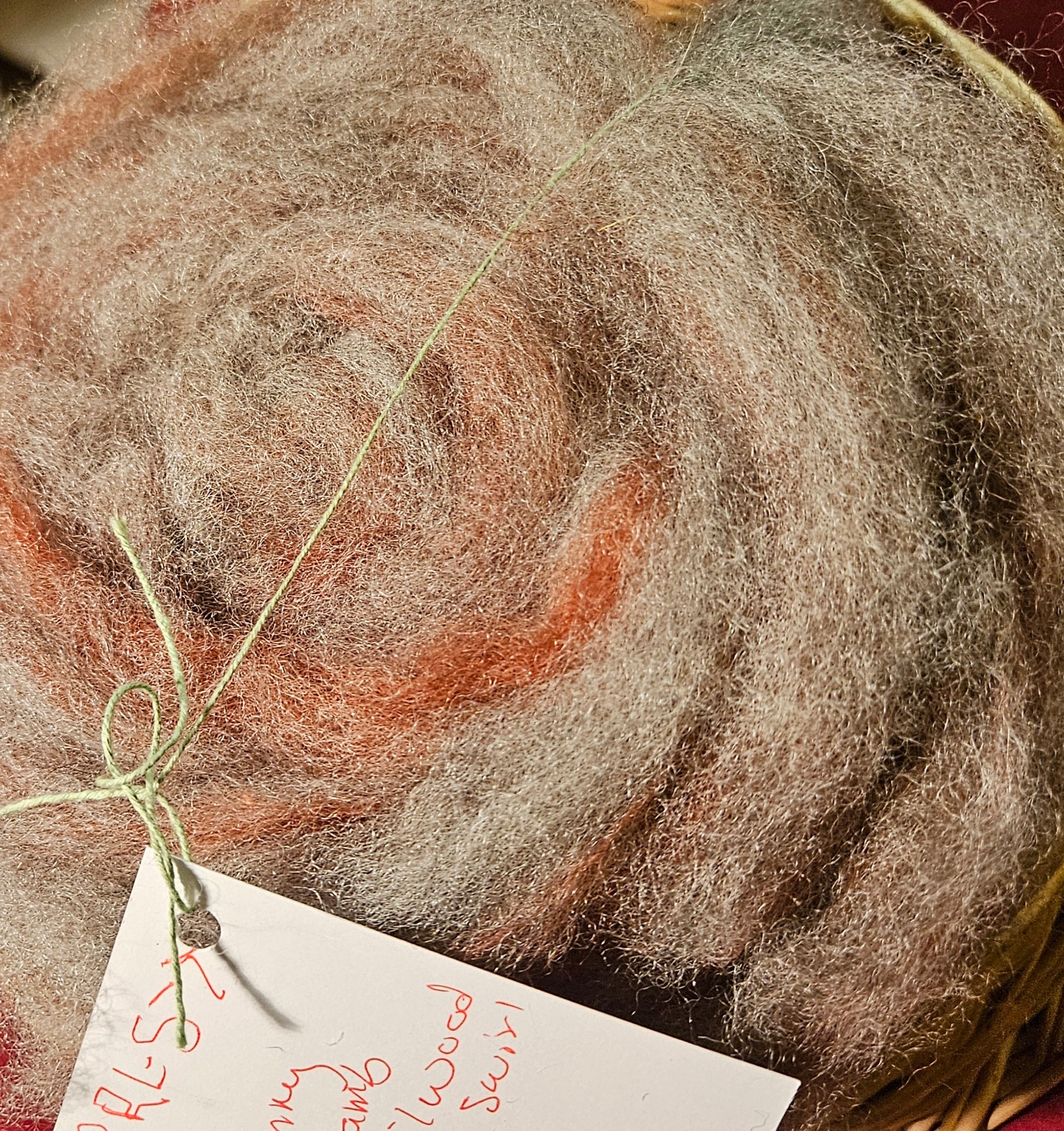 Silver Romney Lamb swirled w /lamb fleece handdyed w/ Brazilwood bark. Fiber Artist and Handspinning ready!