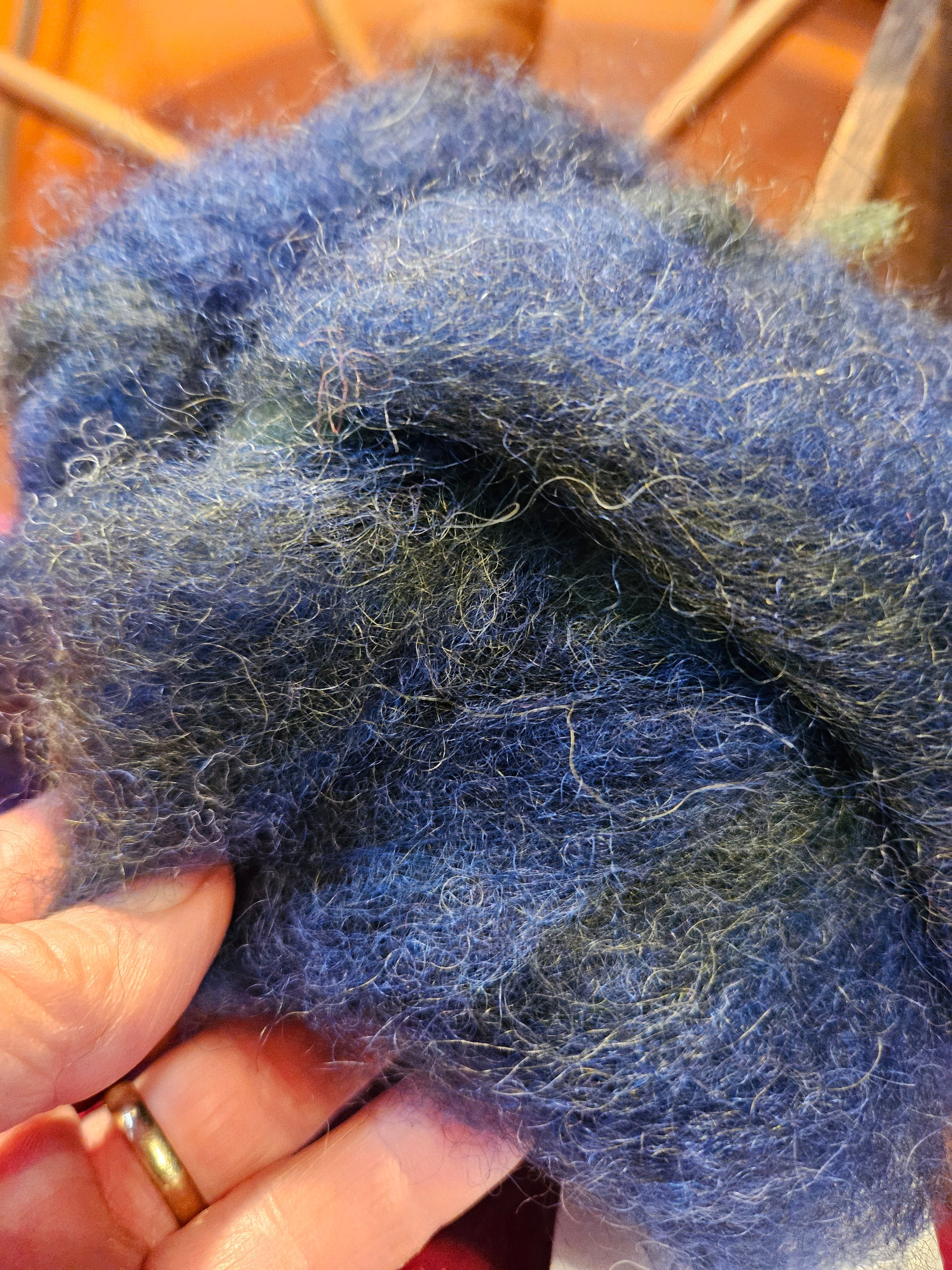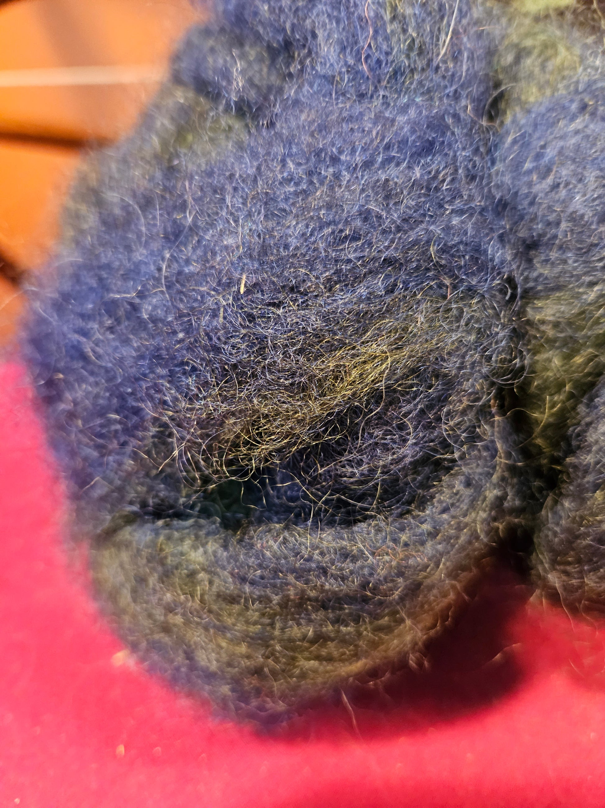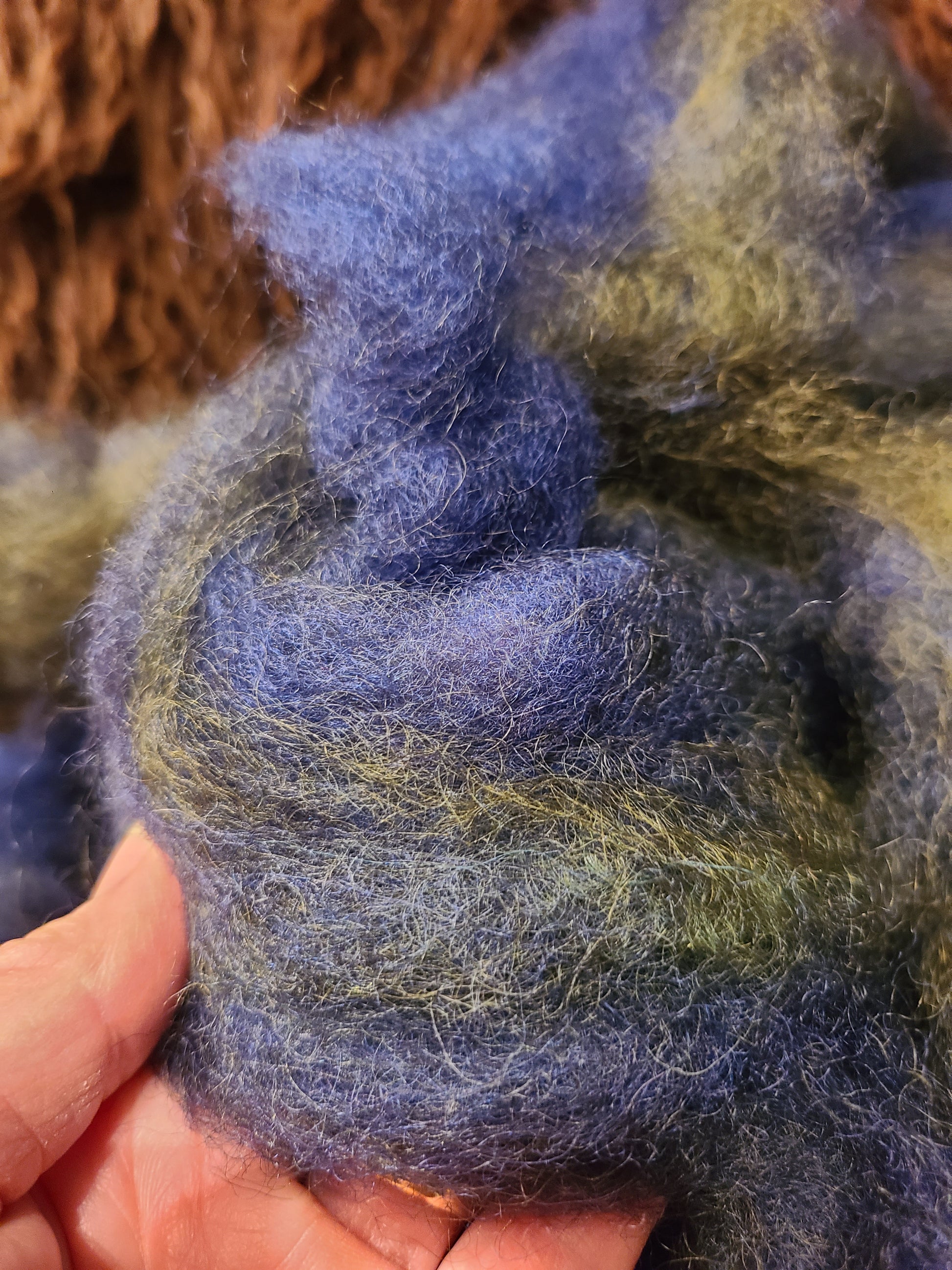 Spectacular blend of Olive and Royal Blue color. Rich color and nice hand to this Roving. Fiber Artist and Handspinning ready!