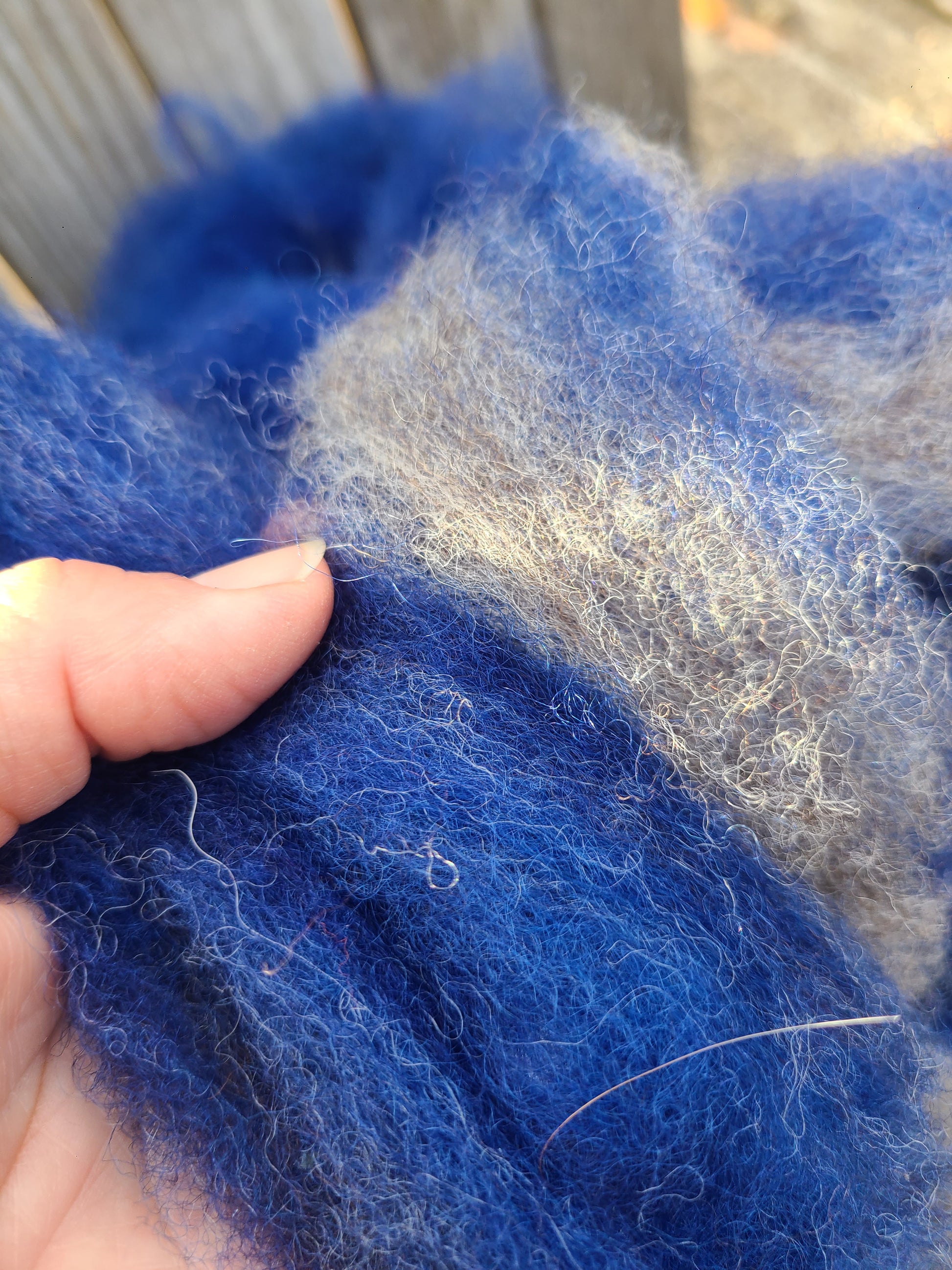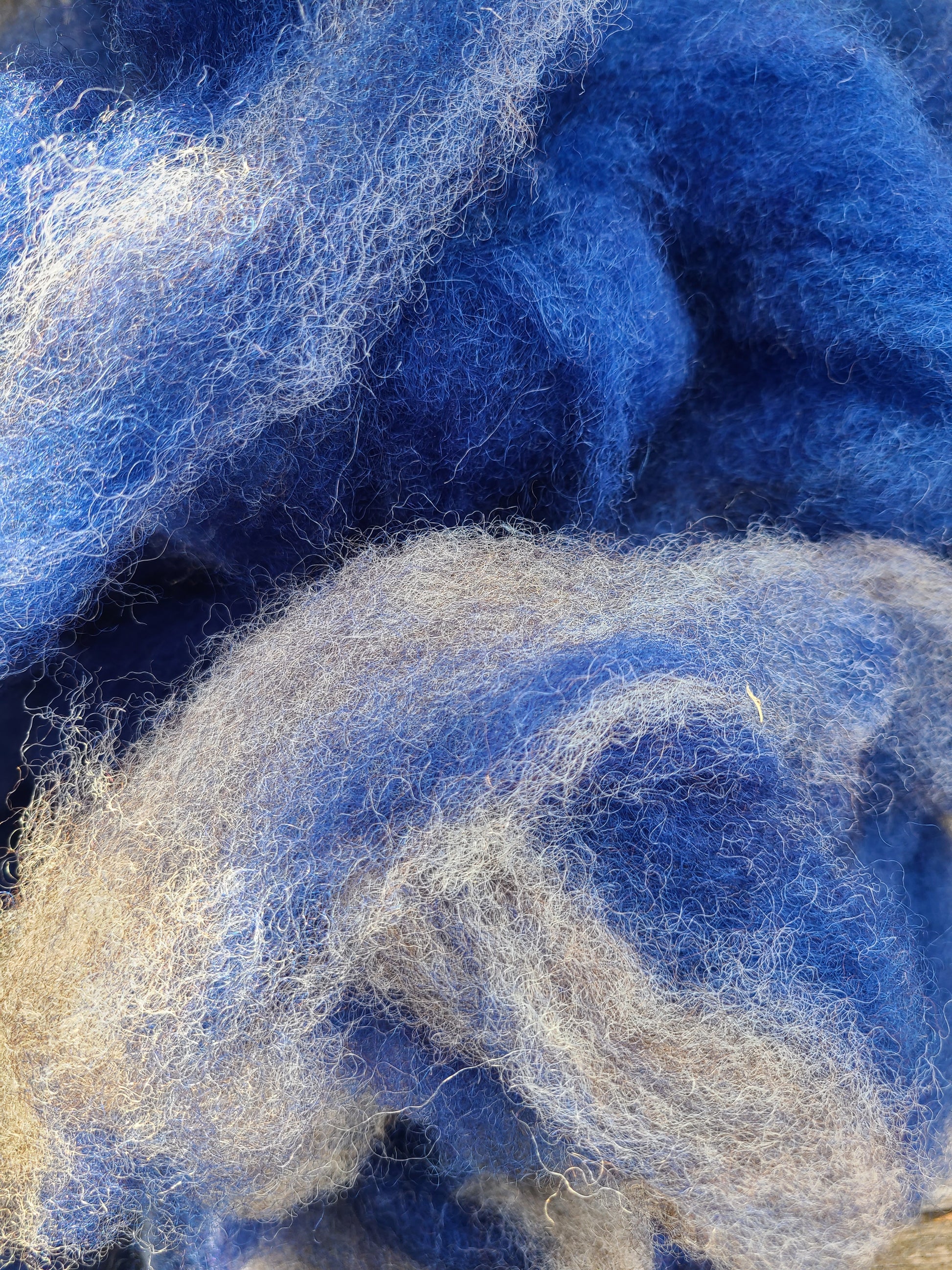 Blend Silver Romney with Farm Dyed Royal Blue Roving with rich color & fluffy hand. Fiber Artist and Handspinning ready!