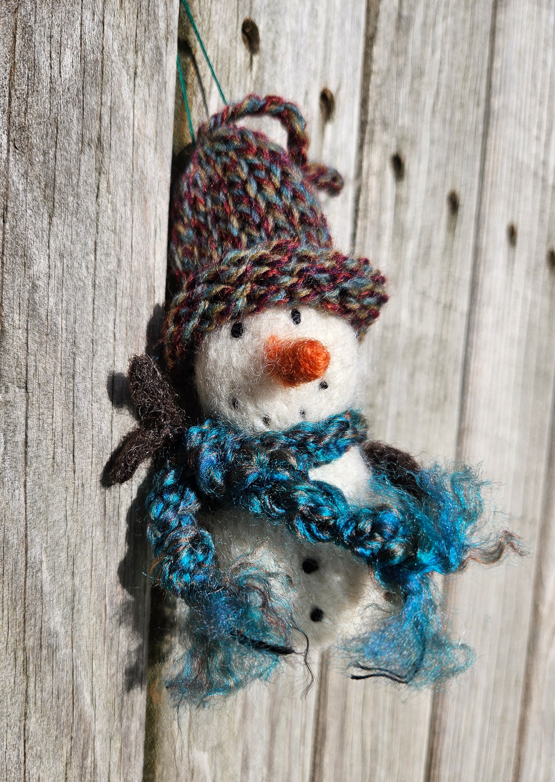 This Whimsical Snowman is Bundled up and ready for sledding in Teal highlighted hat & scarf! 3L&S Romney white yarn makes up this guy. Then Knitted and felted. A cute stocking stuffer to gift. OR Indulge get one for Your Tree.