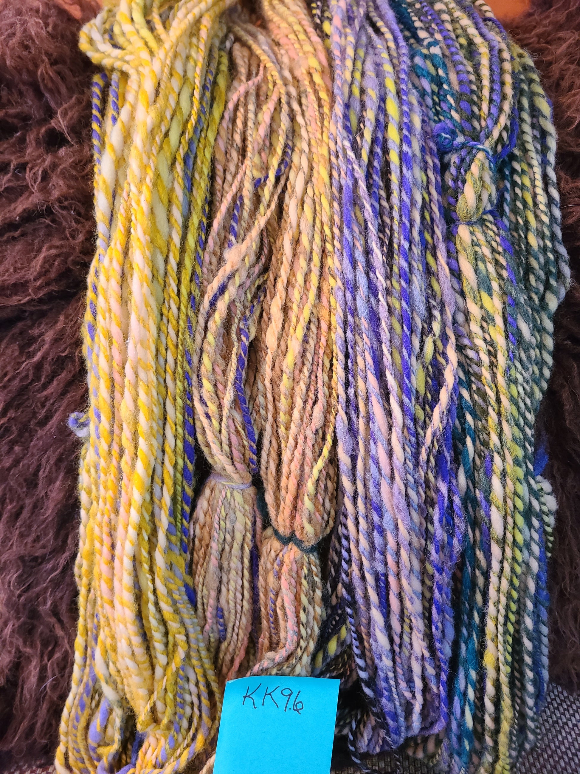 Best of 2 worlds Handspun Yarn Featuring dyed Romney plied with painted Corriedale. Brilliant Romney Color and lofty Corriedale creating Bouncy fun yarn! This should stay in my vault but offering up for your special Knitted, Crocheted or Woven project.